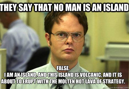 36. “They say that no man is an island. False! I am an island and this island is volcanic. And it is about to erupt. With the molten hot lava of strategy!”