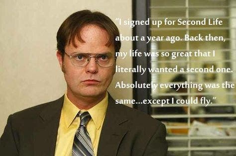 38. “I signed up for a second life about a year ago. Back then, my life was so great that I literally wanted a second one. Absolutely everything was the same … except I could fly.”