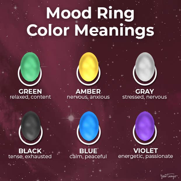 Traditional mood rings dance between six main colors: green, blue, amber, gray, violet, and black.