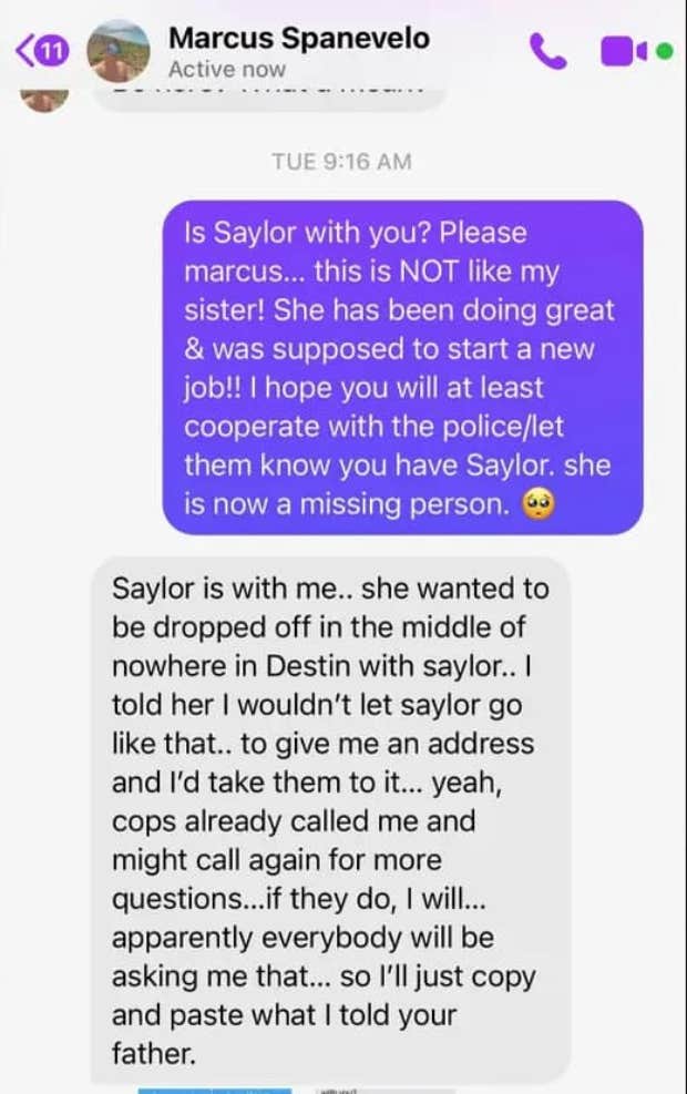 Spanevelo claimed that he had asked him to drop her off "in the middle of nowhere in Destin" to visit a friend in Northwest Florida named Stacey.