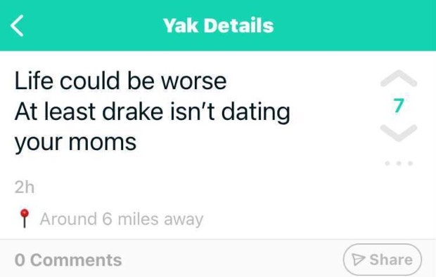 So, given that Yik Yak seems to be passing the safety test so far, we can get back to enjoying some funny content!