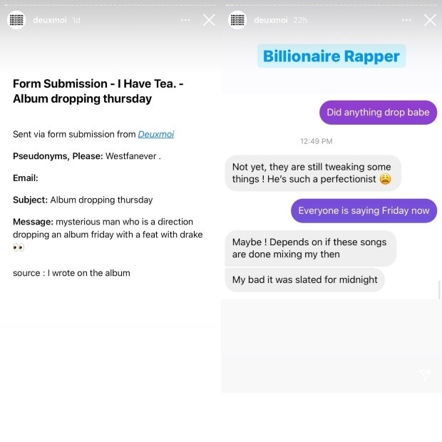 A source claiming to have written on the rumored album claimed that a “mysterious man who is a direction” would be dropping an album featuring Drake. The source said the album would be released on Thursday or Friday while a follow-up post claimed it was slated for a midnight release.