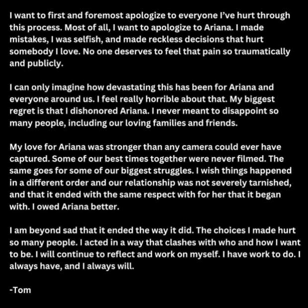 “I want to first and foremost apologize to everyone I’ve hurt through this process,” Sandoval wrote. “Most of all, I want to apologize to Ariana. I made mistakes, I was selfish, and made reckless decisions that hurt somebody I love. No one deserves to feel that pain so traumatically and publicly."