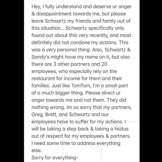 "Hey, I fully understand and deserve ur anger & disappointment towards me, but please leave Schwartz, my friends, and family out of this situation," Sandoval wrote on Instagram. "Just like TomTom, I’m a small part of a much bigger thing. Please direct ur anger towards me and not them. They did nothing wrong. Im so sorry that my partners, Greg, Brett, and Schwartz and our employees have to suffer for my actions. I will be taking a step back & taking a hiatus out of respect for my employees & partners," he continued.