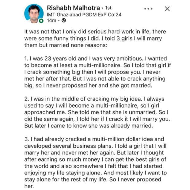 In a LinkedIn post, Rishabh Malhotra shared the story of his reneging on three different women he had intended to marry.