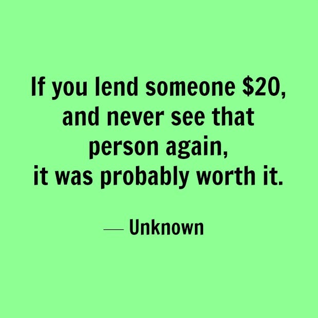 10. "If you lend someone $20, and never see that person again, it was probably worth it." — Unknown