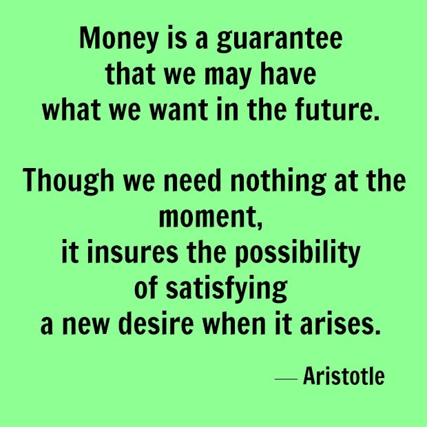 11. "Money is a guarantee that we may have what we want in the future. Though we need nothing at the moment it insures the possibility of satisfying a new desire when it arises." — Aristotle