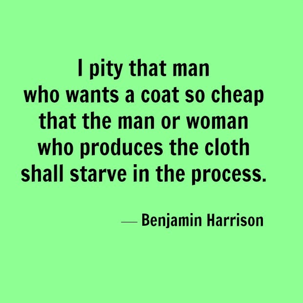 6. "I pity that man who wants a coat so cheap that the man or woman who produces the cloth shall starve in the process." — Benjamin Harrison