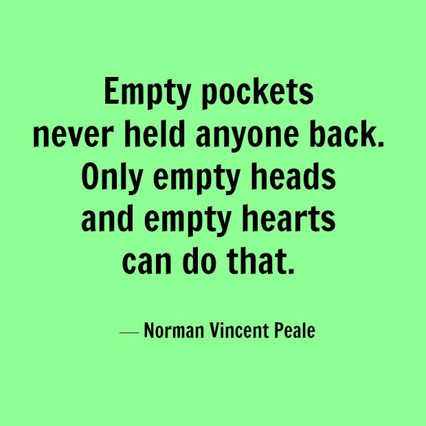 7. "Empty pockets never held anyone back. Only empty heads and empty hearts can do that." — Norman Vincent Peale