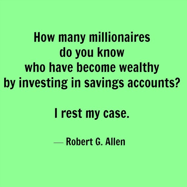 9. "How many millionaires do you know who have become wealthy by investing in savings accounts? I rest my case." — Robert G. Allen
