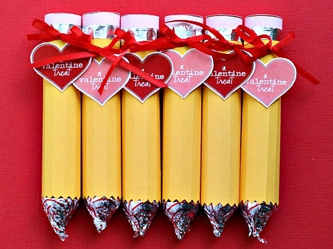 - Glue a Hershey’s kiss to other end of Rolos for the pencil point.