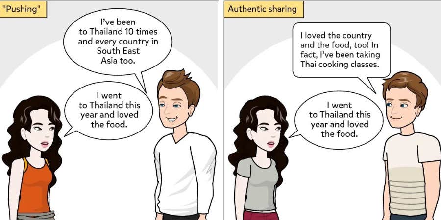 People who push tend to be the ones speaking more than 50 percent of the time. They have so many stories to tell about themselves that they may not even realize that the other person is bored or offended. They also tend to be uncomfortable with pauses and immediately fill it in with stories about themself.