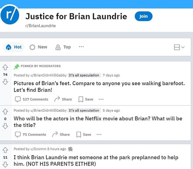One of the top posts labels the Friends Of Brian Laundrie subreddit the “new BLM movement you need to get behind,” making a twisted comparison between defending a man wanted on federal charges and the Black Lives Matter movement.