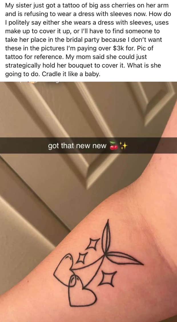 Reddit users have been debating a Facebook post shared by a bride who thinks her sister's tattoo of cherries could be the reason for her wedding’s downfall.