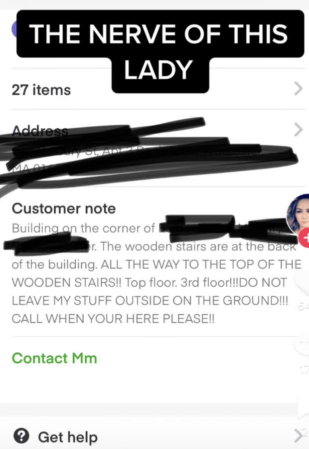 The customer’s home is atop a flight of wooden stairs on the third floor of an apartment building. “THE NERVE OF THIS LADY,” Jackie wrote in the text overlay of a TikTok video she posted regarding the incident along with a screenshot of the customer’s request.