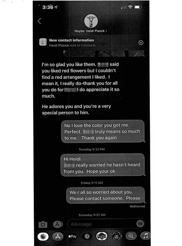 Wayne also sent multiple text messages to Planck in hopes that maybe she’d respond to him, saying, “Hi Heidi. Bond really worried he hasn’t heard from you. Hope your ok.”