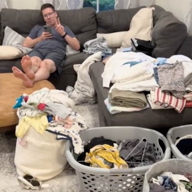 That she defends him as a “really good” partner calls into focus just how low the standards men are held to as partners. In a post from 2022, Donnelly asked her followers, “Is your life more or less laundry?” She panned the camera over five laundry baskets full of unfolded clothes, along with more clothes on the couch, while her husband sat on his phone and flashed her a peace sign.
