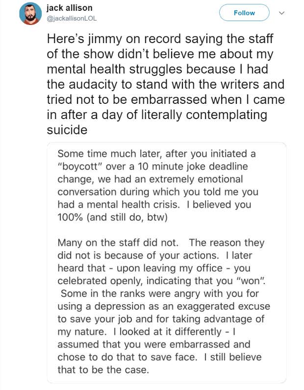 “I had a mental breakdown at @JimmyKimmelLive and took one single day off for mental health,” he wrote. “Then I was ostracized for nearly a year before I quit.”