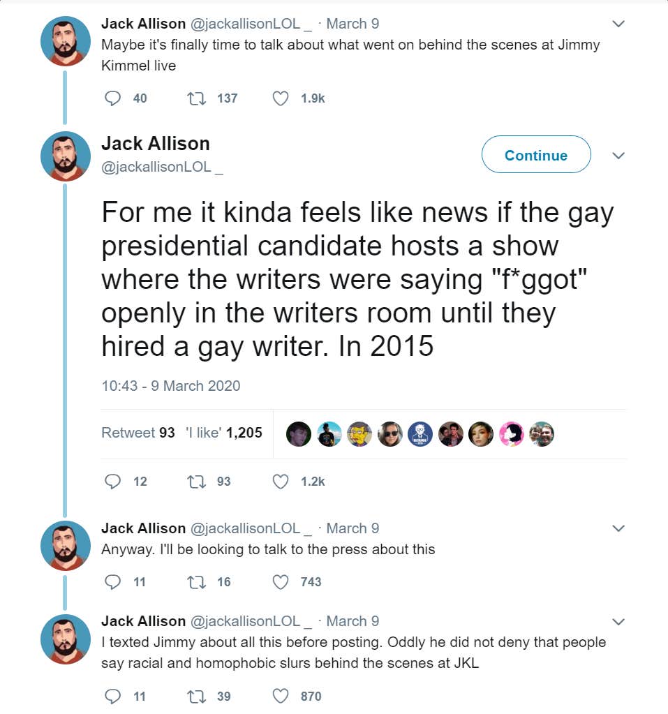 “Maybe it’s finally time to talk about what went on behind the scenes at Jimmy Kimmel live,” wrote Allison. “For me it kinda feels like news if the gay presidential candidate hosts a show where the writers were saying ‘fa--ot’ openly in the writers room until they hired a gay writer. In 2015.”