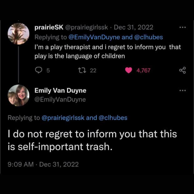 Even when an expert, a play therapist, tried to gently warn that "play is the language of kids," Van Duyne doubled down, calling the advice "self-important trash."