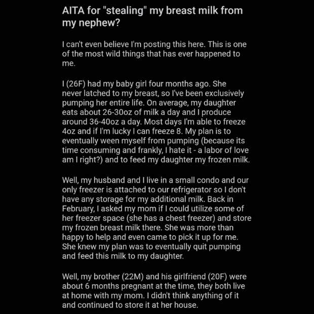 The new mom's brother started stealing her breastmilk and feeding it to his baby.