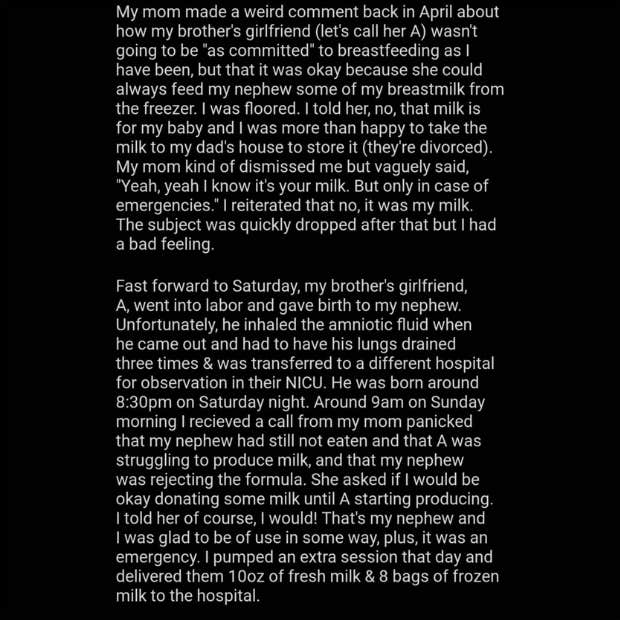 People were astonished that the mom's family was so blasé about stealing her breast milk.