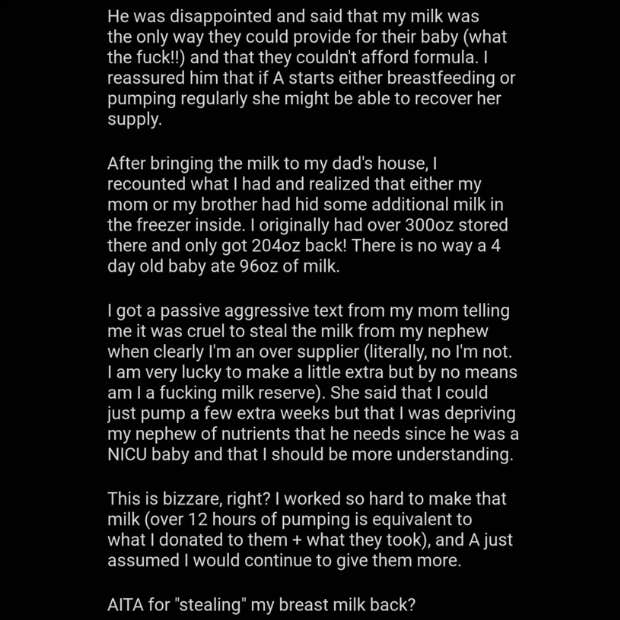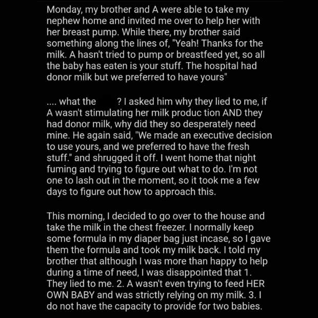 Her brother was "disappointed," she writes, "and said that my milk was the only way they could provide for their baby." He explain to her that they "couldn't afford formula." She told him that if A would actually try, she would likely have more than enough breastmilk supply. She then took her milk and left.
