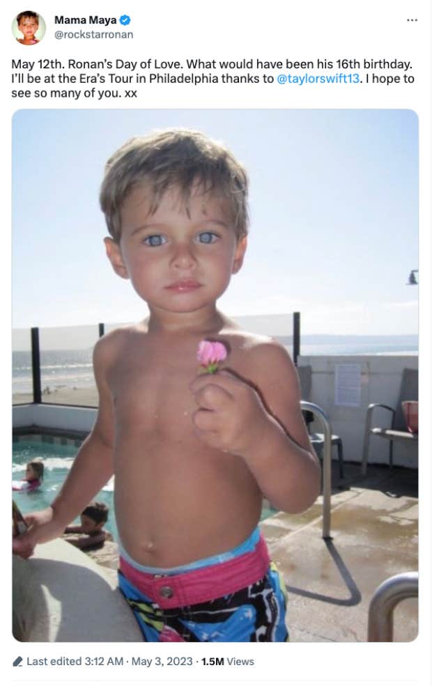 Now, years on, Maya has shared another post about her son ahead of what should have been his 16th birthday on May 12. On Twitter, Maya let her followers know that she would be celebrating Ronan's Day Of Love by attending Swift's Philadelphia concert where she will be continuing her Eras Tour.