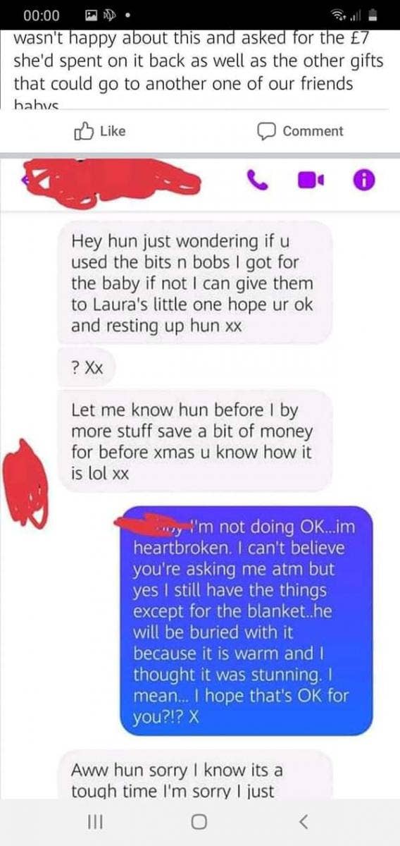 “Hey hun just wondering if you used the bits and bobs I got for the baby if not I can give them to Laura’s little one hope ur ok and resting up hun,” screenshots show the person asked in a message. She tried to justify her request, claiming that she wanted to save money for the holiday season. “Let me know hun before I by more stuff save a bit money for before xmas u know how it is.”