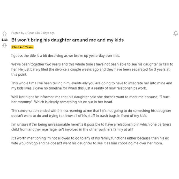 “We've been together [for] two years and this whole time I have not been able to see his daughter or talk to her,” she wrote to Reddit’s “r/Parenting” subreddit. “He just barely filed the divorce a couple [of] weeks ago and they have been separated for 3 years at this point,” she adds, referring to him and his ex.