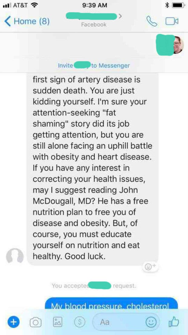 "For 30% the first sign of artery disease is sudden death. You are just kidding yourself. I'm sure your attention-seeking 'fat-shaming' story did its job getting attention, but you are still alone facing an uphill battle with obesity and heart disease. If you have any interest in correcting your health issues, may I suggest John McDougall, MD? He has a free nutrition plan to free you of disease and obesity. But, of course, you must educate yourself on nutrition and eat healthy. Good luck."