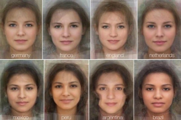 By using a special computer program, scientists put hundreds of pictures of women's faces (centered around the eyes) and created an average face for a variety of countries.